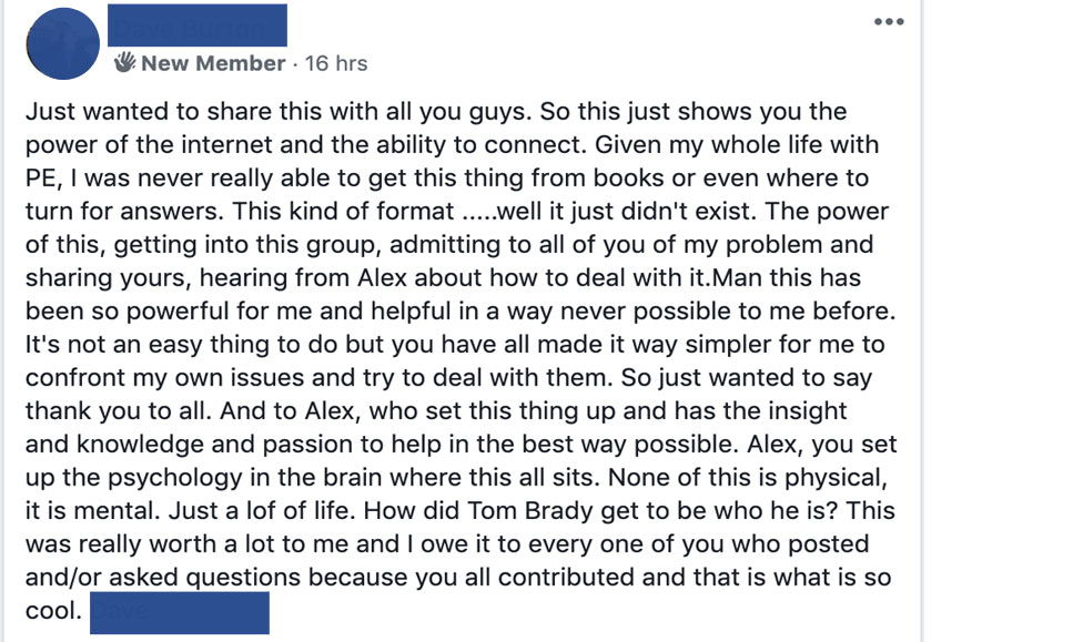 But it took months of practice to master. And for some men who had really severe P.E., and for other men who had just been emotionally and psychologically defeated by their P.E., they found it impossible to even effectively do the practice, and often just gave up before seeing results.